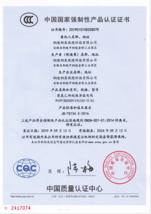 RVVP電線3C認(rèn)證證書