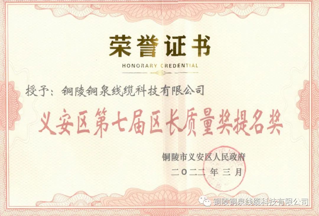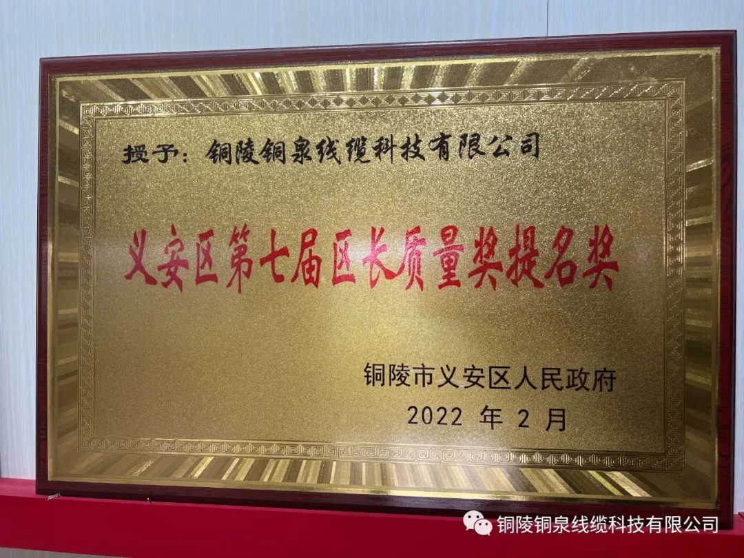 日前,銅陵市義安區(qū)第七屆區(qū)長質量獎出爐,銅泉線纜獲評第七屆“義安區(qū)區(qū)長質量獎提名獎”,共有2家企業(yè)獲此殊榮。